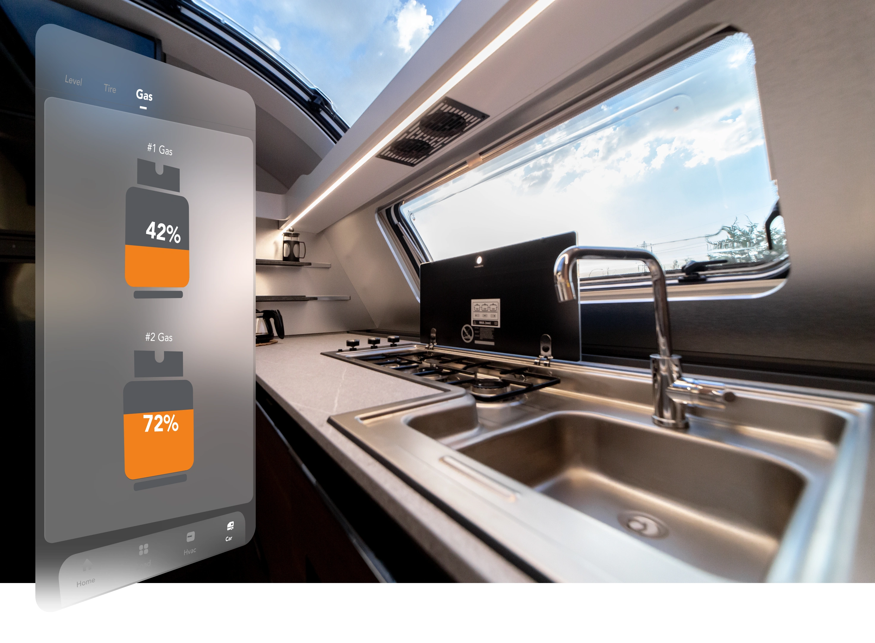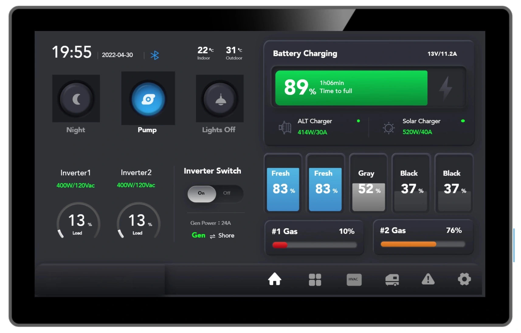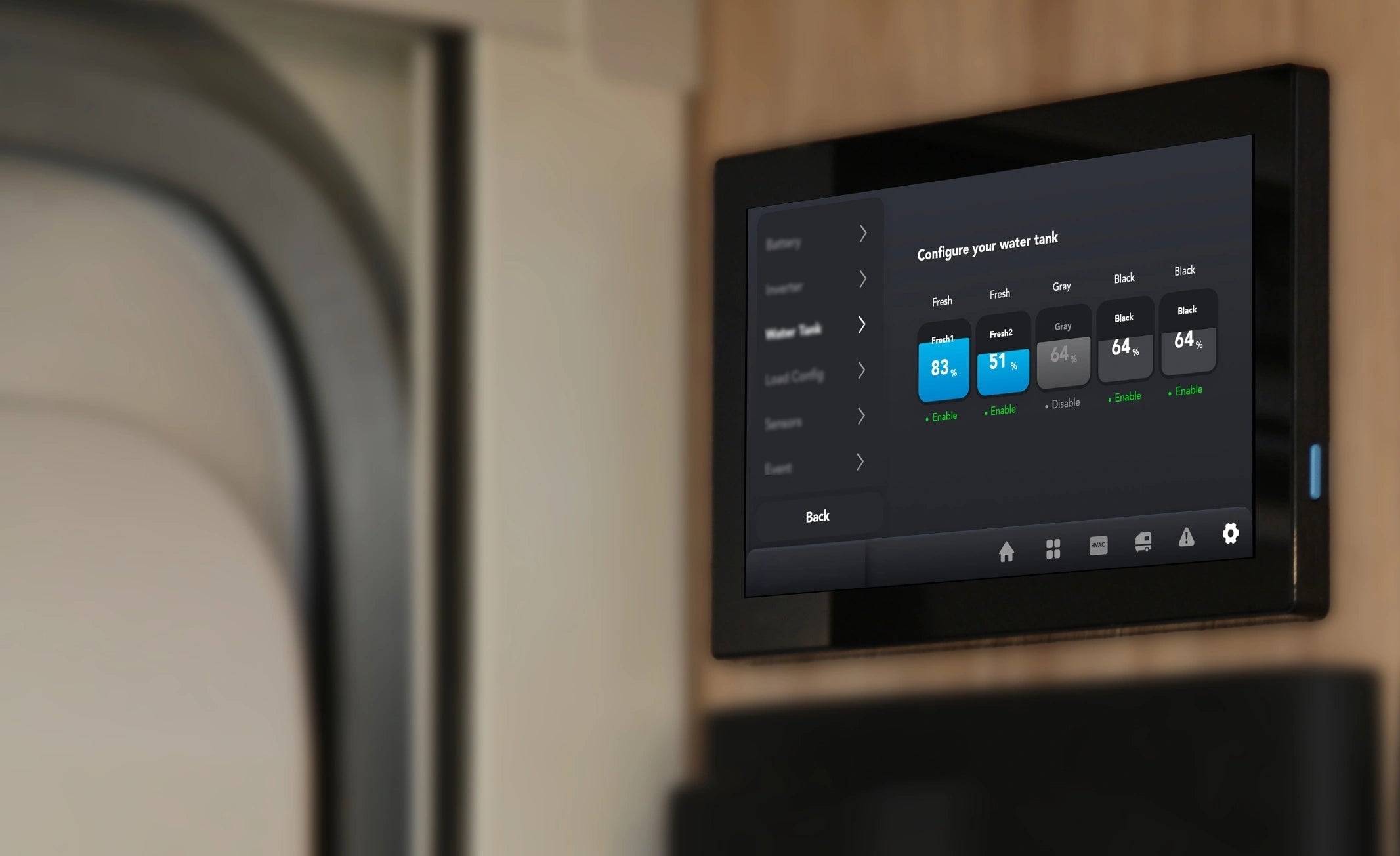 Utility Transparency – Track battery levels, charging sources, and fresh/waste water levels instantly
