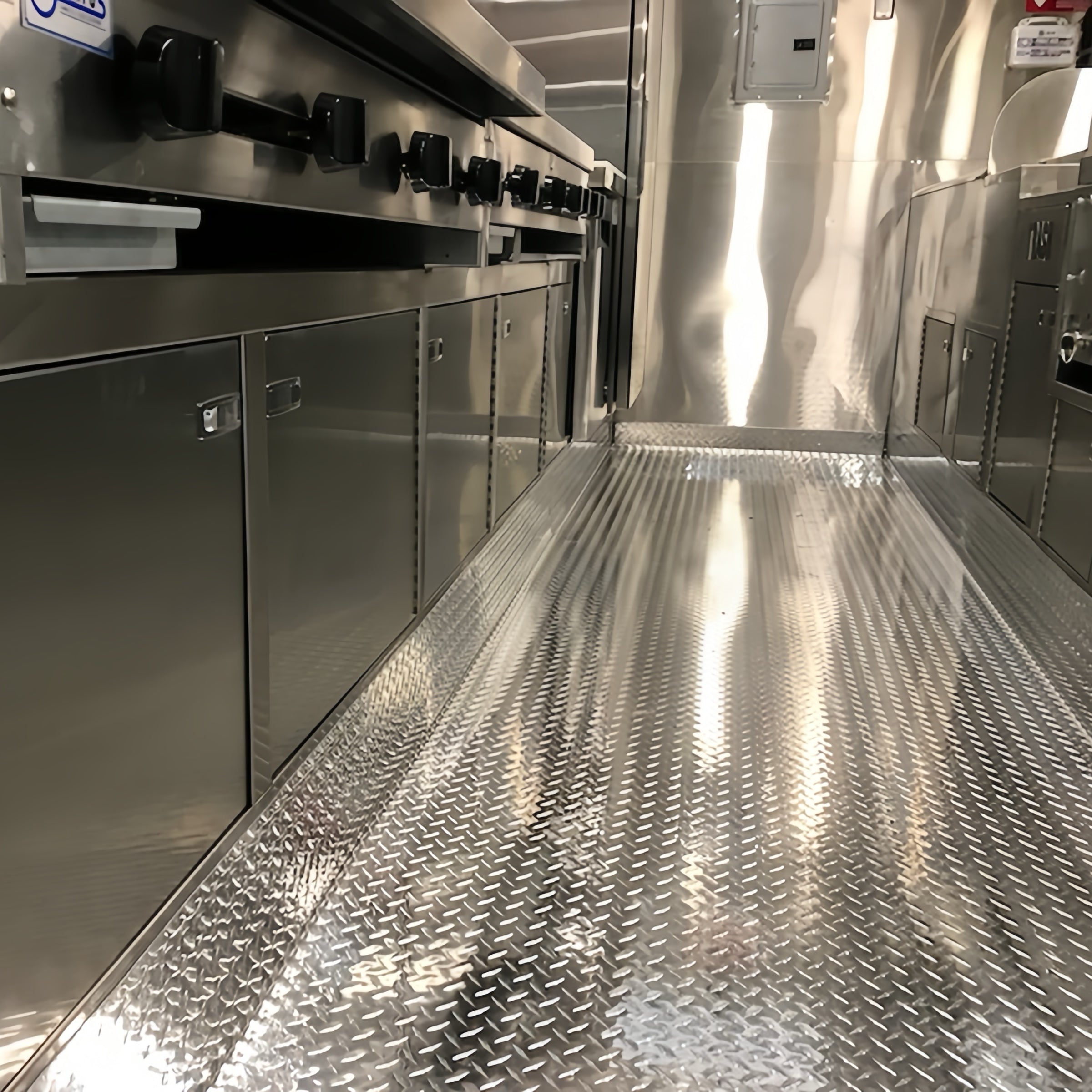 Non-slip aluminum flooring with integrated drain; easy to clean and maintain