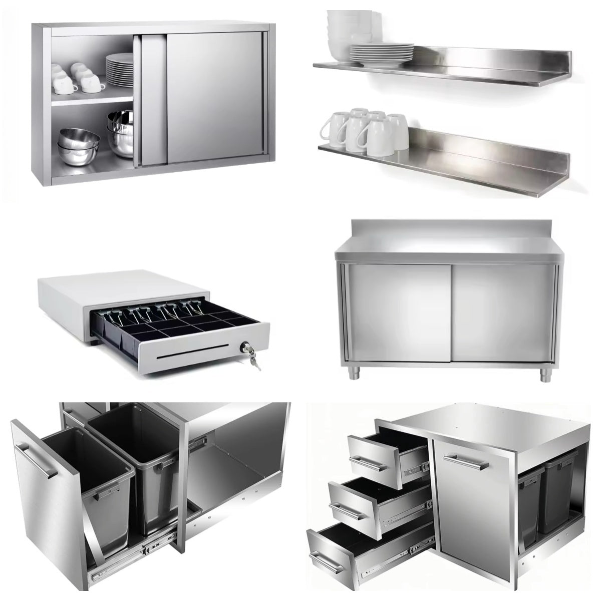 Stainless steel work counters with integrated base cabinets on both sides.