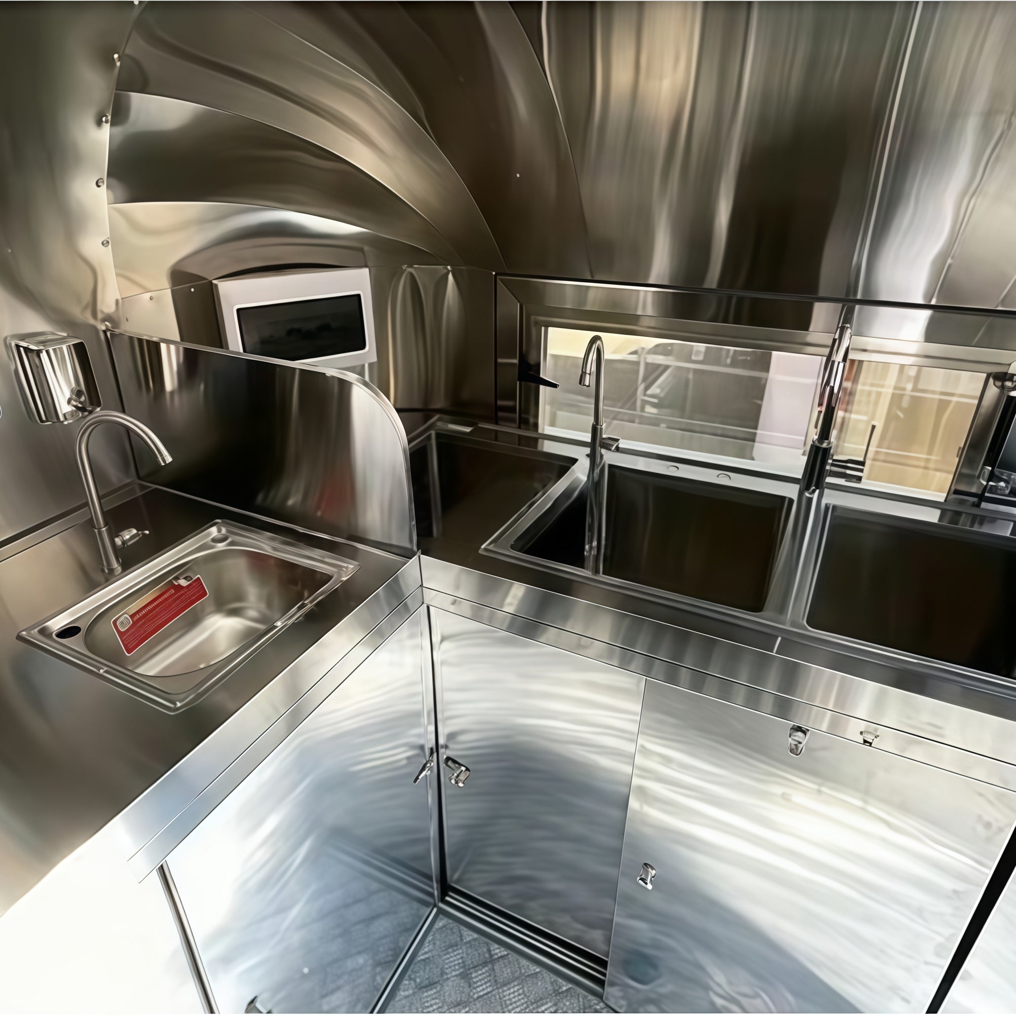 Heavy-duty plumbing system with 12V automatic pump and water heater, providing hot and cold water (configurable to meet local health codes).